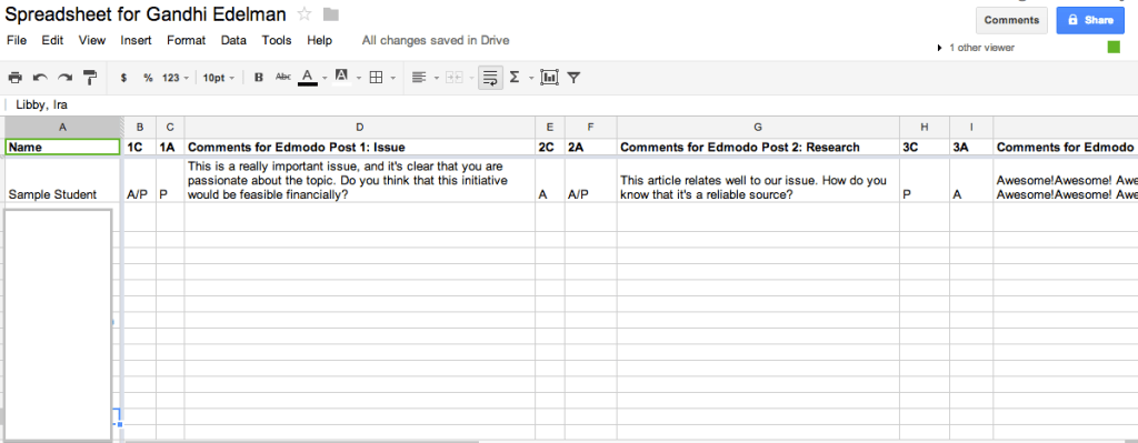 I’ve always dreamed of doing this and I finally figured it out. I will be writing my feedback into a spreadsheet and then using mail merge to print out rubrics to give to students. I have a google doc spreadsheet set up so that I can grade from home or school. Whenever I’m ready (either midway through the project and/or at the end), I can use the magic of technology to mail merge the data from the spreadsheet into my rubric, which is saved on Microsoft Word. In this way, students will get their grades and comments all typed up on their rubric, and I’ll still have my spreadsheet with all my notes. No need for copying, busy work, or fishing for papers. (How this is revised: I’ve always used rubrics in the past, but they’ve been on paper. Because I need to give them back to the students, I’ve always had to take separate notes for myself. Last year, I piloted use of a digital rubric on google docs, but it was a pain to manage 50 different documents.)