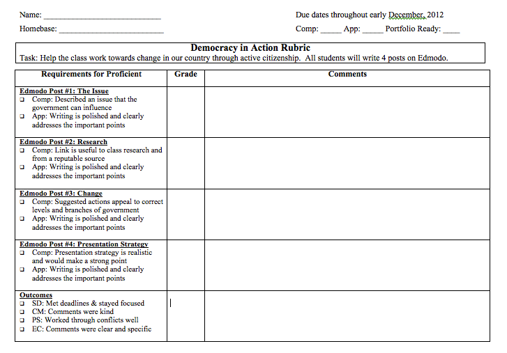 The class will have a lot of work to do: decide what issue to focus on, research what’s already been done on this issue, figure out who to contact and what to say to them, and then strategize how to deliver the message. For each step, each student will be required to create a post on Edmodo. Use of an online discussion board will give voice to some quieter students who are afraid to speak up in class, and students will be able to get deeper into the discussion. Instead of the good old “one person speaks at a time” rule, many students will be actively engaged in dialogue at the same time. One student took a very long time today to get his post finished, and he was frustrated. However, as he walked out, he told me gleefully that in just a few minutes after posting, 5 people had already commented. He left class thrilled. (How this is revised: The old rubric also used Edmodo, but students only wrote one big post. It was sort of like posting an essay online. By the time their peers were commenting, it was too late to make any changes.)