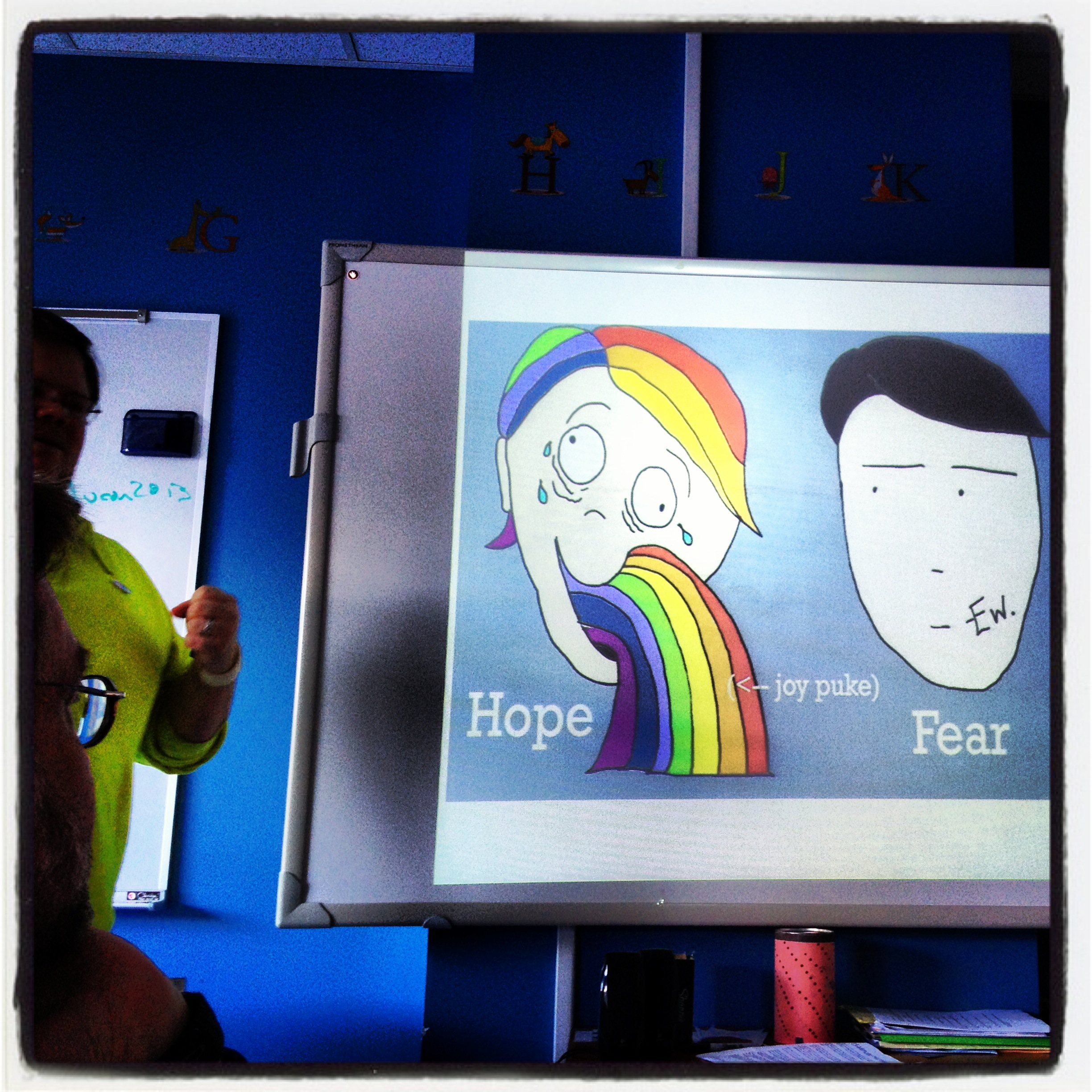 I have some edufuzz, but I’m also hanging on to some of the idealism of the weekend. I went to one workshop called “I was promised flying schools: storytelling the future of public education.” We talked about trying to bring more hope and less fear to this work (note the “joy puke” in the photo below).