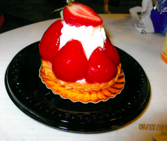 We moved onto France and went into the French bakery. It was hard to choose just one item to try as they all looked wonderful. I finally chose something called Tarte Aux Fraises. It was a mini pie with a custard filling and decorated with whip cream and strawberries on top. It was delicious and very filling even with sharing.Strawberry
